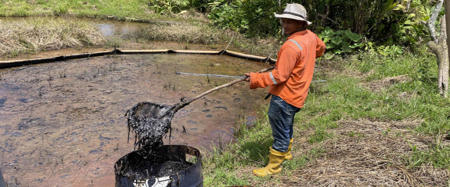 “El campo Drago, desde el 2020, no registra emergencias ambientales”, asegura el Maate en la respuesta a la solicitud de información enviada. Sin embargo, el 21 de septiembre de 2021, la rotura de un ducto dejó una gran piscina de petróleo y lodo en la finca de Francisco Vargas, quien aún no ha recibido indemnización. A tres kilómetros del hogar del líder de la comunidad 29 de Marzo, las manchas negras, densas y aceitosas son más visibles que en los puntos anteriores.