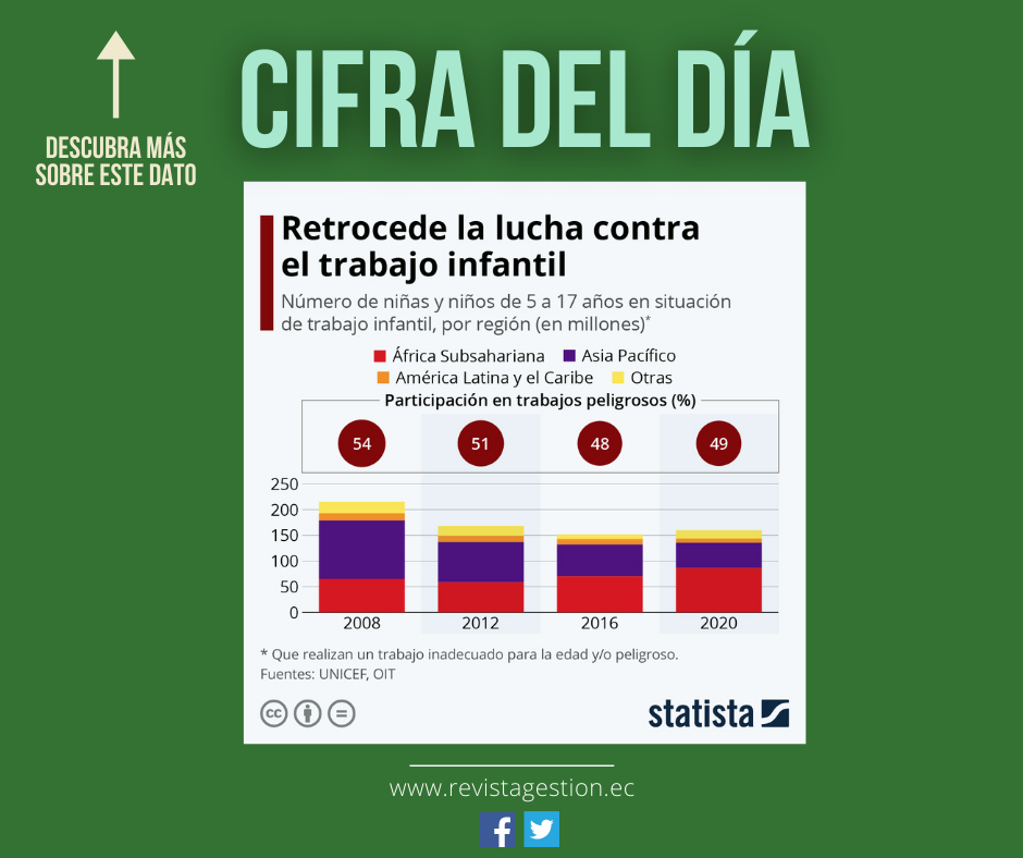 La mayor parte de este retroceso corresponde al África Subsahariana, donde alrededor de 86,6 millones de niños se encuentran en situación de trabajo infantil. Tanto en Asia como en América Latina y el Caribe, las cifras mejoraron en la última década. En 2020, unos 8,2 millones de niñas y niños residentes en Latinoamérica o el Caribe eran víctimas del trabajo infantil, una disminución de más del 40% con respecto a los 14,1 millones de 2008.