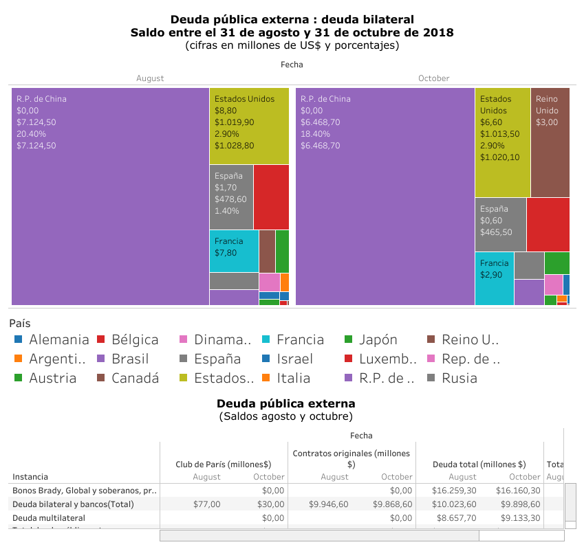 De acuerdo con cifras del Ministerio de Finanzas, la deuda externa pública con China hasta el 31 de agosto de 2018 fue de $ 7.124,5 millones, descendiendo en $ 655,80 millones para octubre (Gráfico 1).