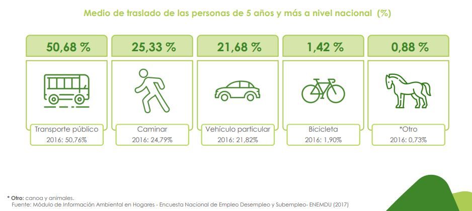 El INEC ejecuta anualmente el Módulo de Información Ambiental en Hogares de la Encuesta Nacional de Empleo, Desempleo y Subempleo (ENEMDU). Según su informe, el principal medio de traslado en la rutina diaria de las personas, es el transporte público (50,68%) que ocupa el primer lugar a nivel nacional, seguido por caminar (25,33%) y vehículo particular (21,68%).