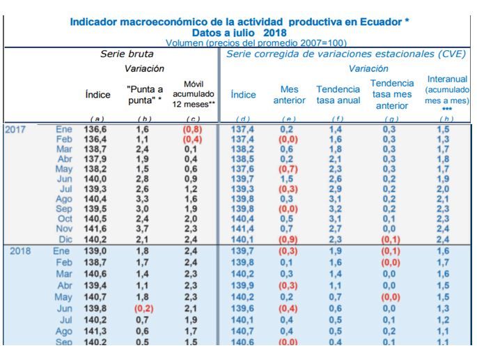 Según el informe de PROestudios, el Índice Macroeconómico de Actividad Productiva del país (IMACRO.ec) aumentó en 1,5 % en septiembre de acuerdo con la tasa interanual móvil acumulada (agosto 2017 - julio 2018); mientras que la tasa acumulada entre enero y septiembre 2018 alcanzó 1,1 %. Asimismo, estima que el PIB en 2018 crecerá en 0,9% y en 1,2% en 2019.
