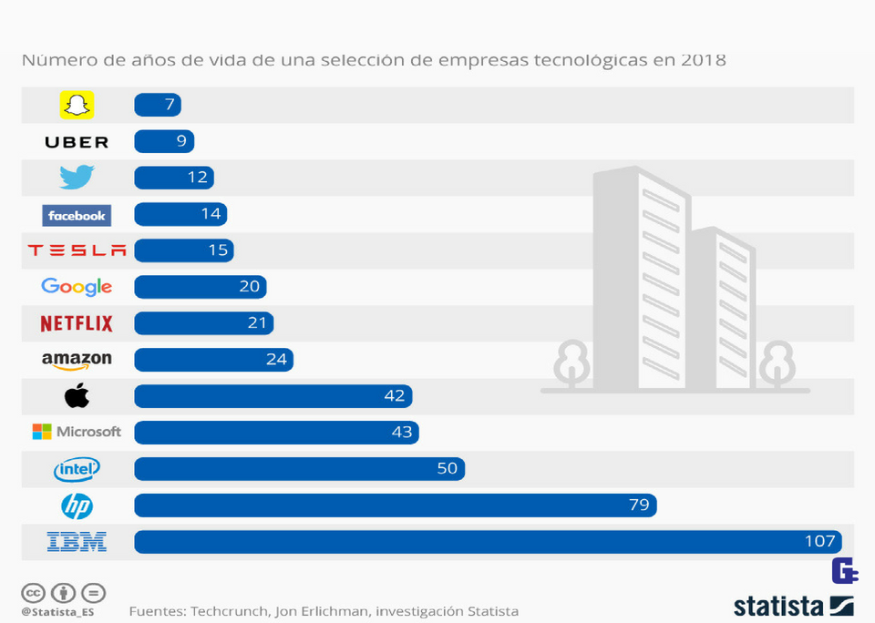 Tal y como muestra este gráfico de Statista, de las empresas aquí mostradas solo dos tienen menos de 10 años de edad: Snapchat, red social curiosamente pensada para los más jóvenes, y Uber. A estas le siguen en juventud Twitter, que fue noticia la semana pasada por obtener por primera vez en su historia beneficios, Facebook y Tesla.