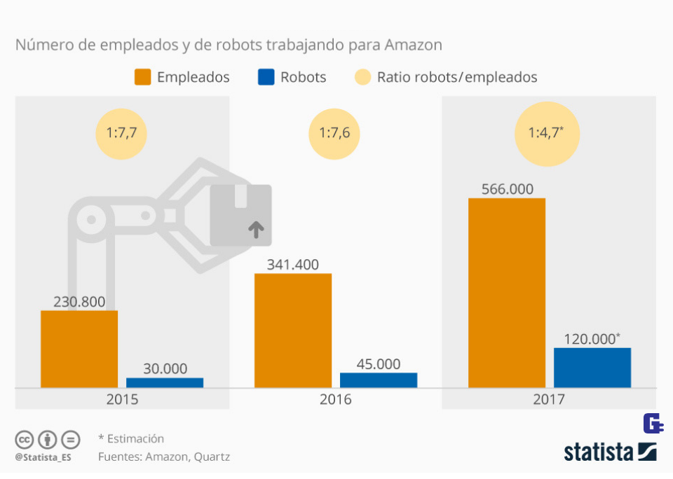 El número de robots usados por Amazon en 2017 fue de alrededor de 120.000 unidades frente a las 45.000 del año anterior, esto es, casi tres veces más, según estimaciones de la publicación Quartz. Gracias a este aumento, el año pasado finalizó con una proporción de una máquina automatizada por cada 4,7 trabajadores, un récord en el nivel de automatización de la tienda de ecommerce.
