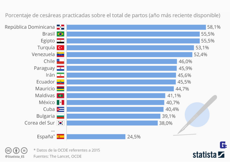 Tal y como muestra este gráfico de Statista, en algunos de estos países la proporción de nacimientos a través de esta cirugía es incluso mayor que las de parto común, como es el caso de República Dominicana (con un 58,1% del total), Brasil (55,5%) y Venezuela (52,4%).