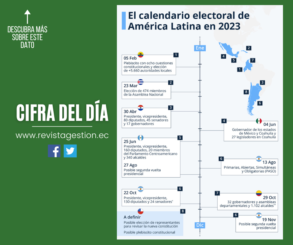 Con el inicio de febrero, se inaugura lo que será un ajetreado calendario electoral para América Latina en 2023. Este domingo 5 de febrero, Ecuador es la primera nación de la región en acudir a las urnas. Los ecuatorianos darán su parecer en un plebiscito constitucional que incluye ocho preguntas en torno a seguridad, institucionalidad y medio ambiente. Entre ellas, se someterá a consulta popular la posibilidad de extraditar ciudadanos ecuatorianos relacionados con el crimen organizado internacional, la posibilidad de reducir el número de miembros de la Asamblea Nacional —el máximo órgano legislativo— y el establecimiento de compensaciones estatales para personas y comunidades del país. Además, los ecuatorianos elegirán a más de 5.660 autoridades locales, específicamente, 23 prefecturas y viceprefecturas, 221 alcaldías, 1.307 consejos y 4.109 miembros de juntas vecinales.