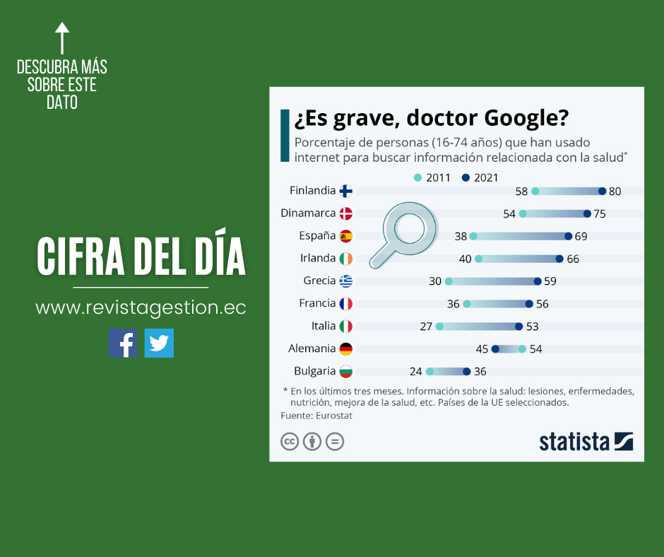 En 2021, el 69% de la población española usó la red para buscar información relacionada con la salud en los tres meses anteriores a una encuesta anual de Eurostat, mientras que en 2011 solo el 38% recurrió a ella. La evolución de esta tendencia es bastante similar en los demás países europeos, a excepción de Alemania, donde el porcentaje de personas que se conectan a internet para informarse sobre cuestiones médicas ha disminuido durante este periodo (del 54% al 45%). Los finlandeses son los más propensos a navegar por la red para buscar información sanitaria, con un 80% en 2021. En cambio, esta práctica está menos extendida en países como Rumanía (40%) y Bulgaria (36%).