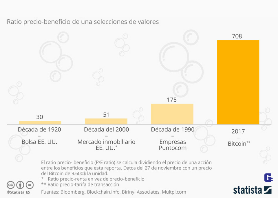 En la actualidad, teniendo en cuenta que los beneficios que Bitcoin reporta son relativamente bajos (identificados por Bloomberg como los costes de transacción, de 219 millones de dólares estadounidenses) y el precio de cada unidad de esta criptomoneda se encuentra por las nubes (una capitalización de mercado de 155.000 millones de dólares), el ratio precio-beneficio asciende a 708. Esta cifra es mayor que la de las grandes burbujas financieras de la historia, incluida la de las empresas Puntocom y la del mercado inmobiliario estadounidenses en 2007-2008, según la publicación Bloomberg.