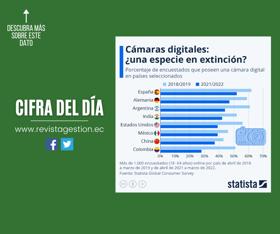 Desde que las cámaras de los teléfonos inteligentes pueden ser tan buenas o incluso mejores que muchas de las cámaras del mercado masivo, muchos no ven el sentido de llevar un dispositivo adicional, y con razón. Como muestra el siguiente gráfico basado en datos de la macroencuesta Global Consumer Survey de Statista, la proporción de propietarios de cámaras digitales ha disminuido en todo el mundo en los últimos años y, probablemente, aún más el número de usuarios. Por ejemplo, en España, el 62% de los encuestados declararon tener una cámara digital en 2018/2019. Tres años después, el porcentaje descendía hasta el 52%. Un descenso mucho mayor se ha producido en Colombia, donde el porcentaje de personas que poseen una cámara digital se ha reducido 23 puntos porcentuales.