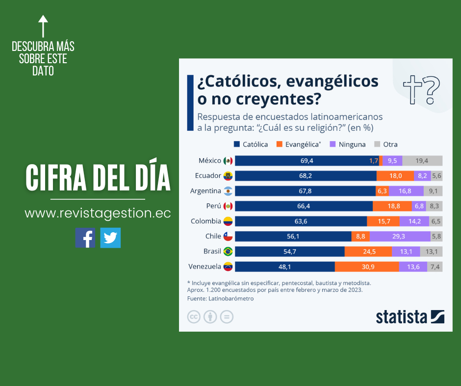 Hablando de la religión católica romana, México es uno de los países con una mayor proporción de sus habitantes adeptos a dicho credo. Casi el 70% de los entrevistados mexicanos respondieron ser católicos, de acuerdo con datos del estudio de opinión pública Latinobarómetro. Del mismo modo, en países como Argentina, Ecuador, Perú y Colombia alrededor de dos de cada tres afirmaron profesar la religión católica.