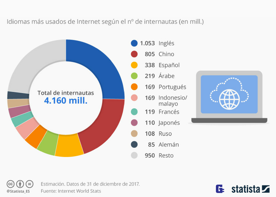 Tal y como muestra el siguiente gráfico de Statista, según cálculos de la página de estadísticas Internet World Stats, este número alcanzó en 2017 los 805 millones de personas, convirtiéndose en la segunda lengua más hablada tras el inglés (1.053 millones), por encima del español (338 millones).
