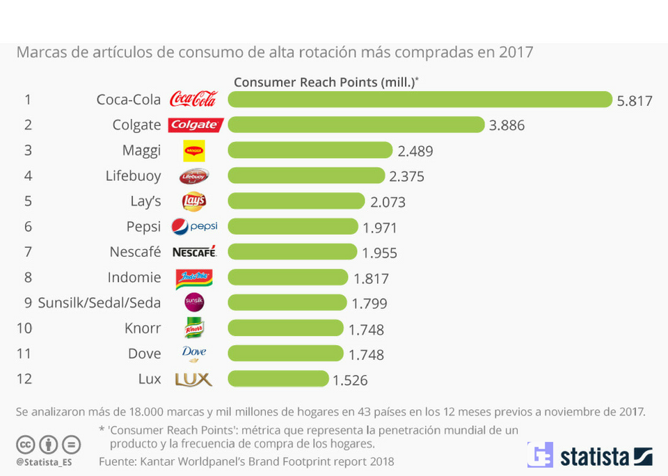 En este, la empresa clasifica a las marcas según una métrica llamada 'Consumer Reach Points', que representa el número total de veces que un artículo es adquirido. En el caso de Coca Cola, esta cifra supera las 5.800 millones de veces en todo el mundo de noviembre de 2016 a noviembre de 2017.