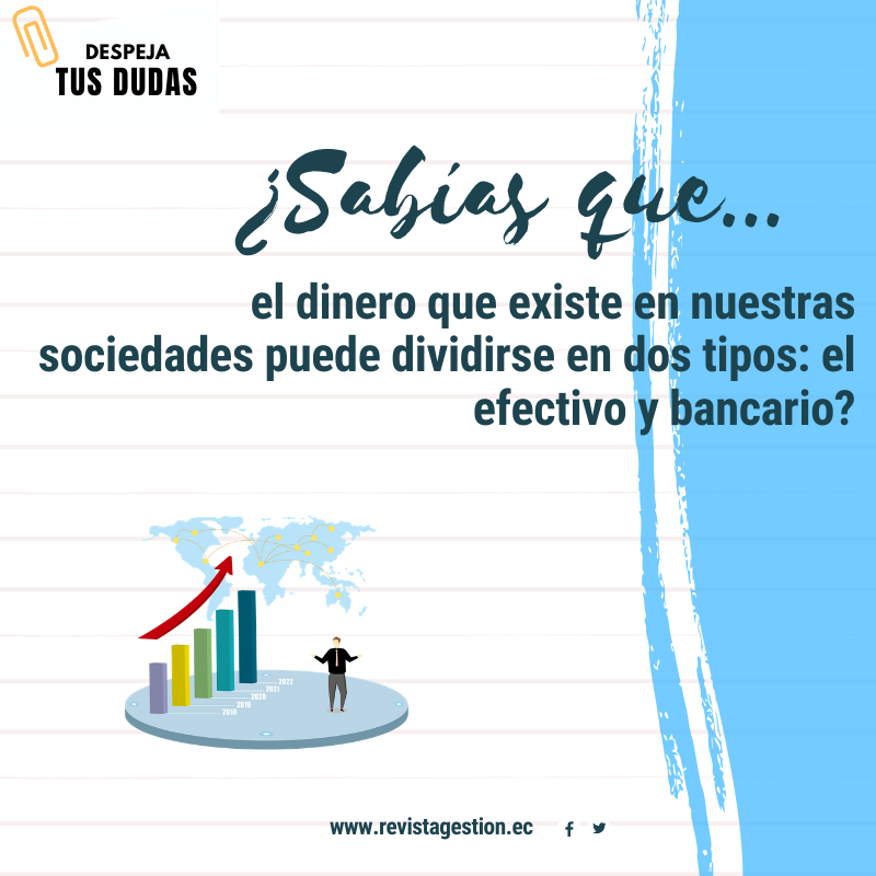 El dinero que existe hoy en día en nuestras sociedades puede dividirse en dos tipos: por un lado está el dinero en efectivo (el dinero físico compuesto por billetes y monedas), y el dinero bancario (las anotaciones digitales como las que vemos en nuestra cuenta del banco).