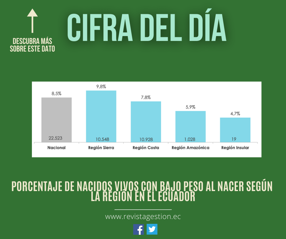 En el 2020, en la Sierra se registraron 10.548 nacidos vivos con bajo peso al nacer, que representa el 9,8% del total de nacidos vivos de esa región. En la Costa se registraron 10.928 nacidos vivos con bajo peso al nacer, que equivale al 7,8%; y, en la región Amazónica hubo 1.028 nacidos vivos con bajo peso al nacer que representa el 5,9%.