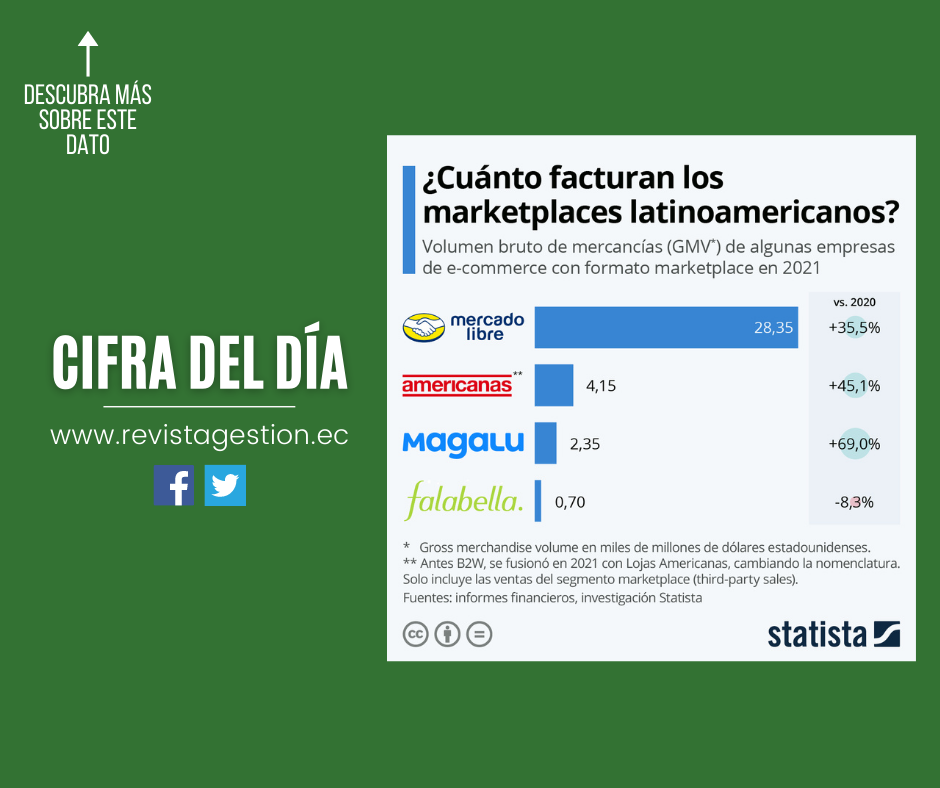 Americanas SA, fruto de la fusión entre Lojas Americanas y B2W, también registró resultados positivos. En comparación con 2020, su marketplace digital expandió sus ventas en más de un 45%, alcanzando un volumen de mercancía bruta (GMV, por sus siglas en inglés) de 4.150 millones de dólares en 2021. Mientras que la también brasileña Magazine Luiza (Magalu) vio crecer su GMV en un 69% ese año, la chilena Falabella experimentó una ligera caída frente a los 763 millones de dólares vendidos durante el primer año de la pandemia.