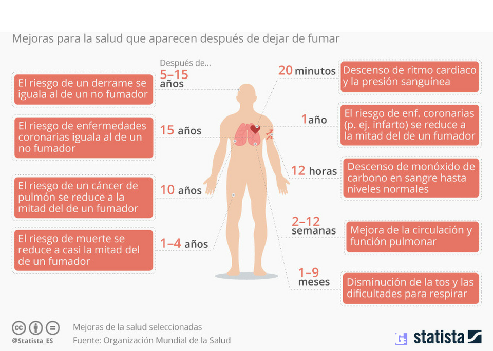 Entre las mejoras de salud a largo plazo no encender un cigarrillo nunca más se encuentra, lógicamente, la disminución de las probabilidades de padecer las grandes enfermedades asociadas con el tabaquismo. Entre ellas, la prevalencia de un cáncer de pulmón (que en diez años se reduce a la mitad) y el riesgo de enfermedades coronarias, como el infarto, que en quince año se iguala a la de un no fumador. En solo un plazo de uno a cuatro años, el exfumador cuenta con un riesgo total de fallecer de alrededor de la mitad de un fumador.