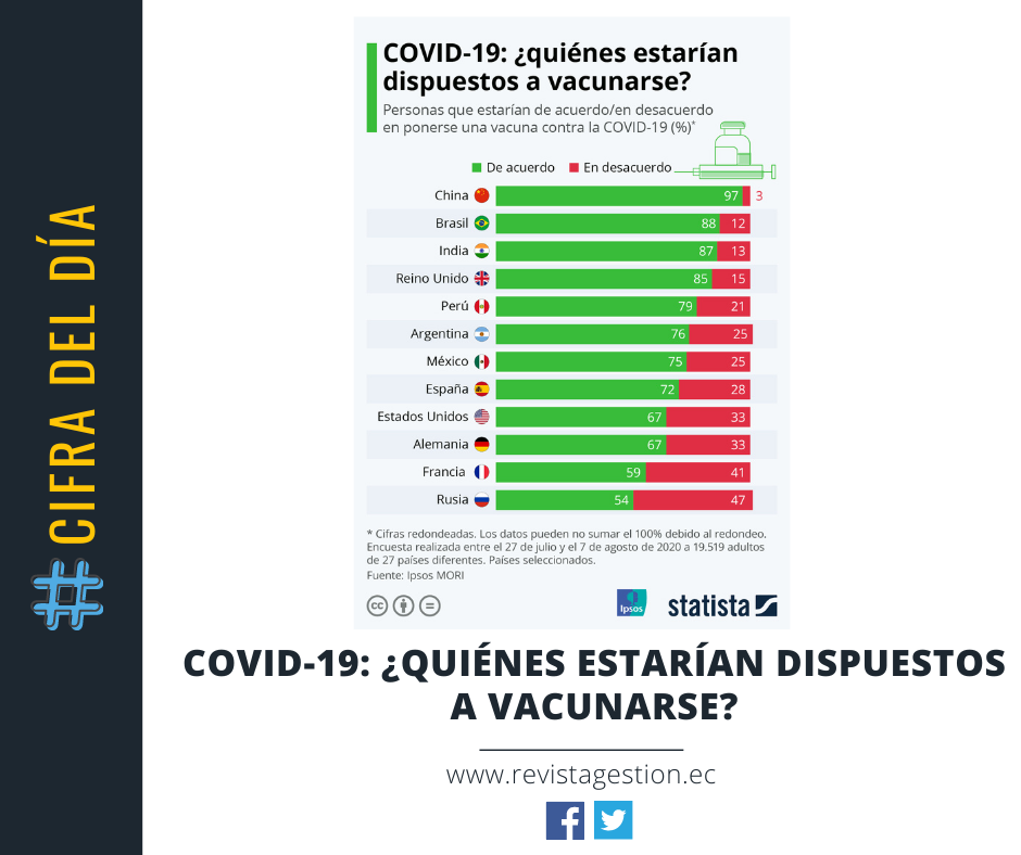 Según una encuesta llevada a cabo por Ipsos MORI en 27 países, el 72% de los españoles asegura que se pondría una vacuna contra la COVID-19 si estuviera disponible. España es el segundo país europeo con más ciudadanos dispuestos a vacunarse, sólo por detrás de Reino Unido (85%). En Estados Unidos, el país con más casos de coronavirus registrados, un 67% de personas se pondría la vacuna, mientras que en Brasil, segundo país del mundo en número de contagiados, lo haría el 88% de la población. Sólo el 54% de los rusos tomarían una vacuna si estuviera disponible, y la proporción de personas que lo haría en Francia también es baja, un 59%, según la investigación.
