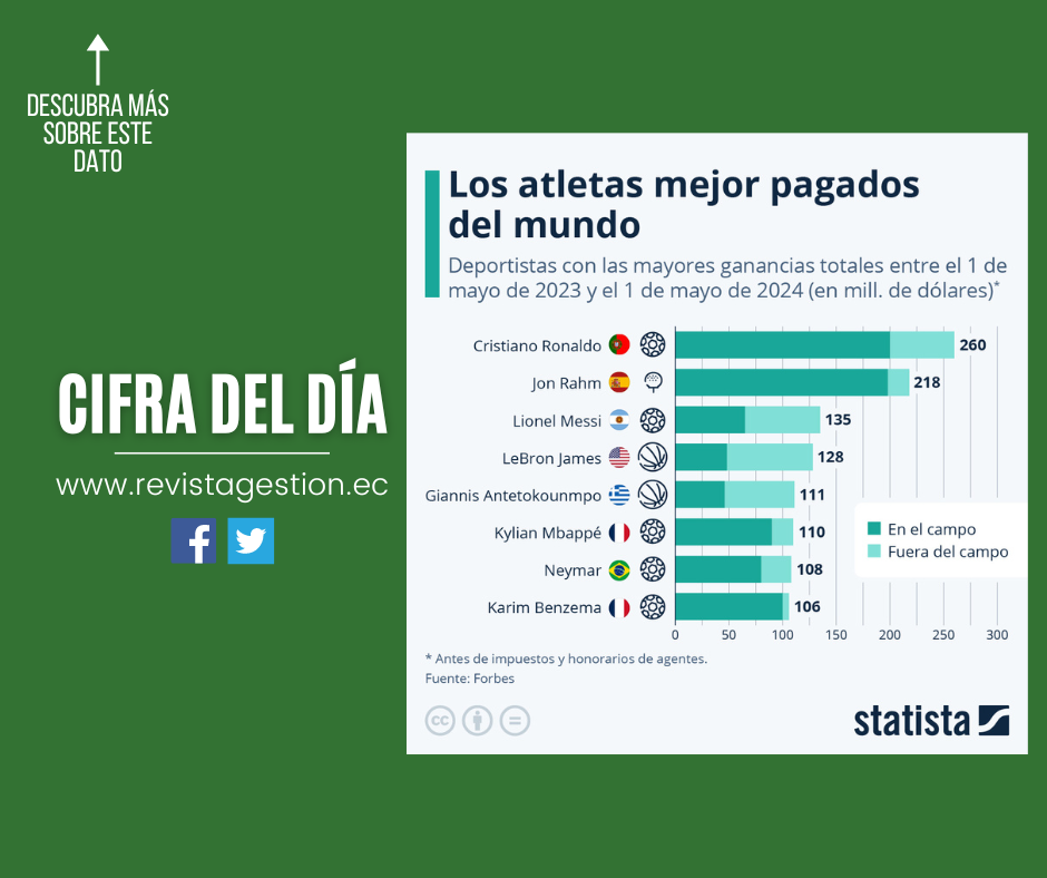 Las ganancias dentro y fuera del campo están igualadas en el caso de Lionel Messi, pero no en el del resto de los ocho atletas mejor pagados. Por ejemplo, Karim Benzema se llevó a casa 100 millones de dólares por sus actuaciones en el campo, pero ocupa el octavo lugar en la clasificación general debido a que ganó una cifra comparativamente más baja fuera de él (seis millones). La estrella del baloncesto estadounidense LeBron James se llevó, con diferencia, los mayores ingresos fuera del terreno de juego, con 80 millones de dólares, seguido de Messi, con 70 millones.