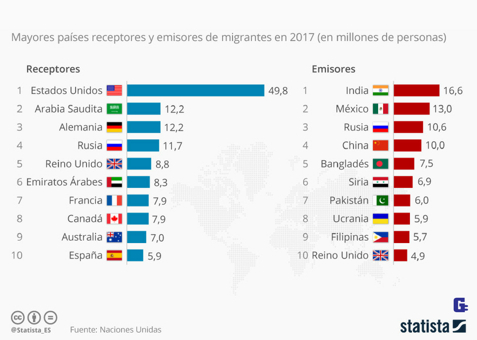 ¿Cuáles son los países de los que más personas emigran y los que más acogen?