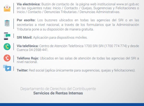 Usted puede informar el cumplimiento de sus derechos presentando sus sugerencias, felicitaciones, quejas o denuncias a través de los siguientes canales que le facilita el SRI: