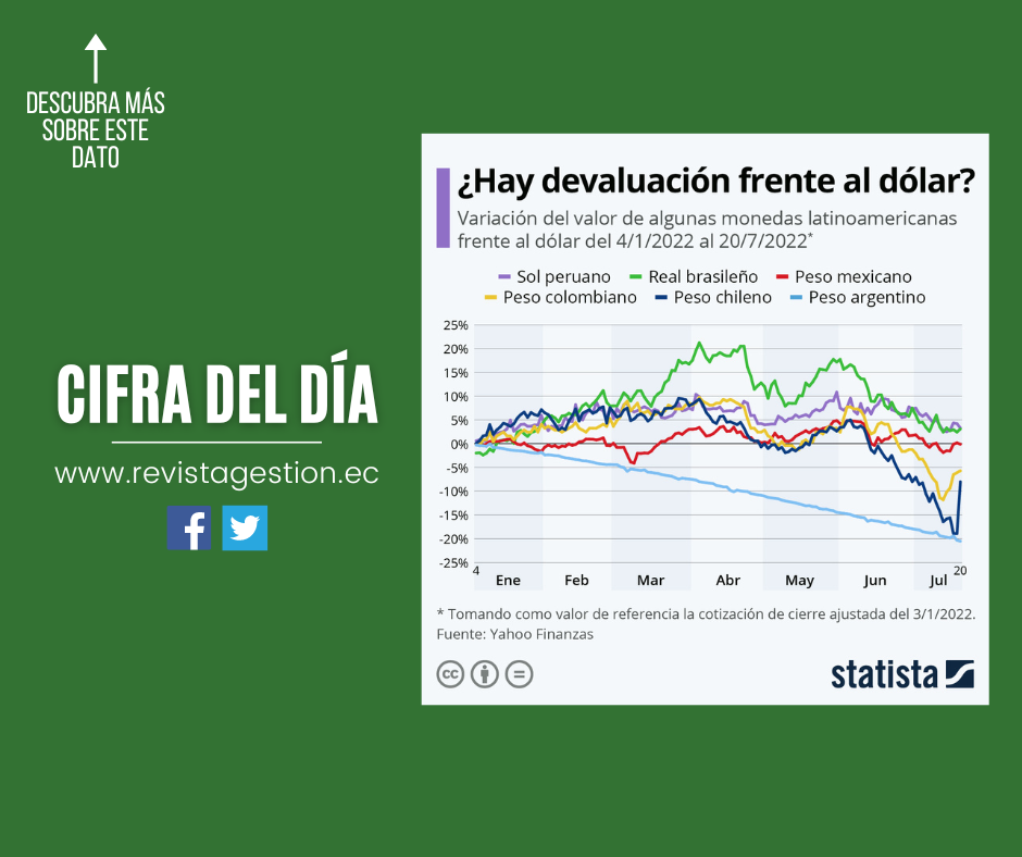 Si comparamos a las denominaciones monetarias de las seis principales economías de la región, vemos que las monedas de Argentina, Chile y Colombia han sufrido las mayores devaluaciones frente al dólar estadounidense desde principios de 2022. Tomando como referencia la primera cotización del año, correspondiente al 3 de enero, el peso argentino registra la mayor pérdida de valor con respecto a la divisa estadounidense. La cotización de cierre vigente el 20 de julio de 2022 indica que la moneda argentina arrastra una devaluación de más del 20% en comparación con su valor del 3 de enero, según los datos de Yahoo! Finanzas. El peso chileno, en tanto, cotiza un 8% a la baja con respecto al dólar este 20 de julio, si bien llegó a rozar una pérdida del 19% de su valor el 18 y 19 de julio. La moneda colombiana, por su parte, ha perdido casi un 6% de su valor en comparación a la divisa estadounidense, aunque también llegó a registrar una pérdida de dos dígitos en la segunda semana de julio.