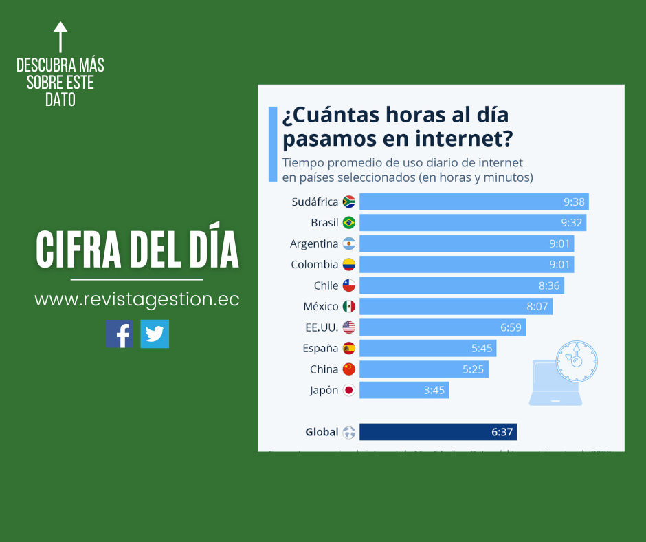 Ya sea a través de una computadora, un smartphone o cualquier otro dispositivo, lo cierto es que cada vez pasamos más tiempo online, tendencia que se intensificó en los años más álgidos de la pandemia. Los latinoamericanos, en particular, registran algunos de los tiempos de navegación más elevados de los 46 países analizados. Los internautas de Brasil, Argentina y Colombia destinan más de nueve horas diarias a surfear la web, incluidas las redes sociales. Los mexicanos, a su vez, dedican algo más de un tercio del día en internet (ocho horas y siete minutos). España se encuentra casi una hora por debajo de la media global con cinco horas y 45 minutos. El puesto más bajo del estudio lo ocupa Japón, con tres horas y 45 minutos de presencia online al día.