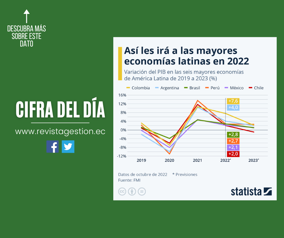 Si analizamos a las seis mayores economías latinoamericanas –Brasil, México, Argentina, Colombia, Chile y Perú, en orden de magnitud según su producto interno bruto (PIB) por paridad de poder adquisitivo en 2021– Colombia es el mercado que se espera crezca al mayor ritmo en 2022, con una tasa del 7,6%. Chile y México registran el menor crecimento esperado de las seis principales economías, con un 2% y un 2,1%, respectivamente.