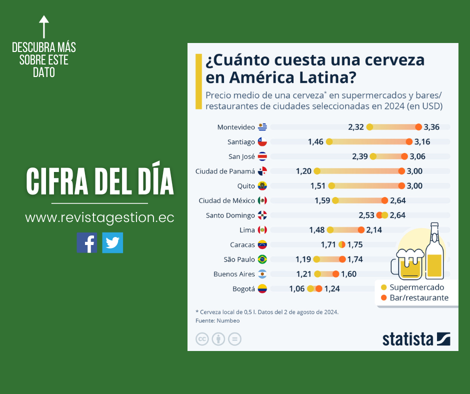 En Quito (Ecuador) tomar un par de cervezas fuera de casa puede suponer tener que aumentar el presupuesto, ya que los precios representan el doble que en los supermercados. Por el contrario, en Santo Domingo (República Dominicana), San José (Costa Rica), Caracas (Venezuela) y Bogotá (Colombia) la diferencia entre una cerveza en un establecimiento gastronómico o en una tienda local es de apenas unos centavos.