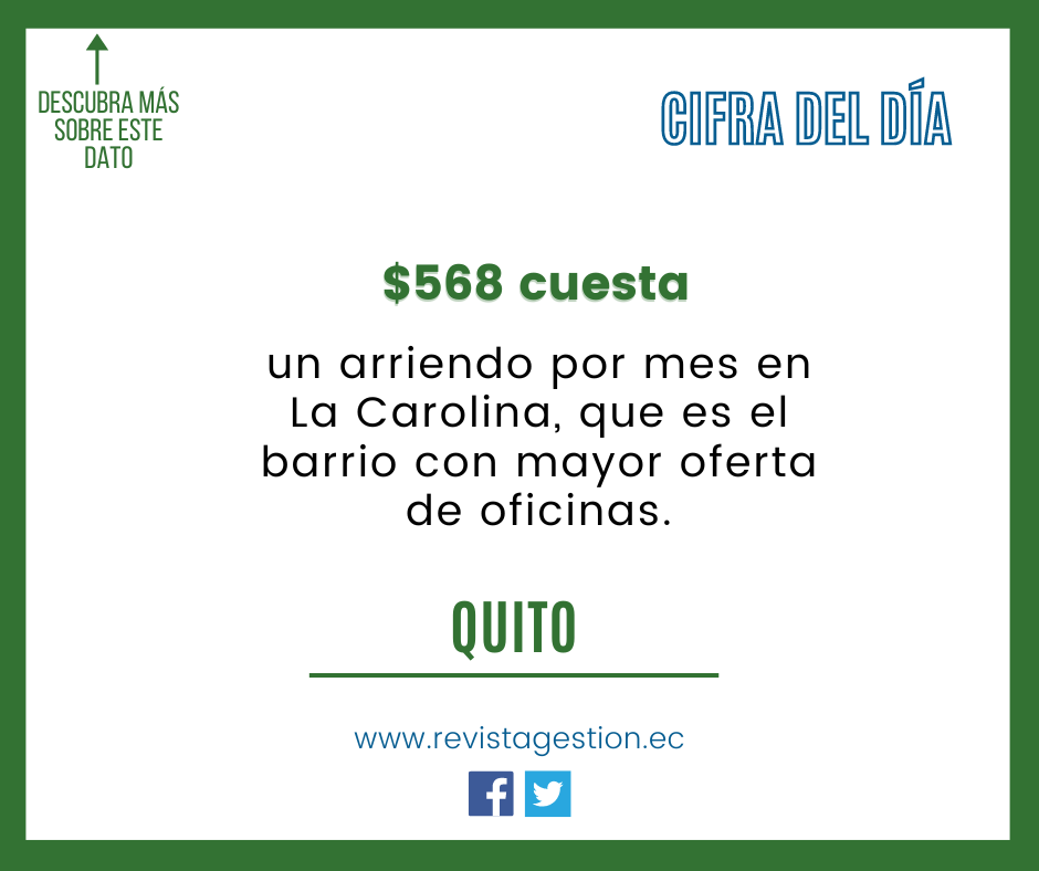La Carolina es el barrio con la oferta de oficinas, se ubica en $1409 por metro cuadrado, y un arriendo $568 por mes. Le siguen Cumbayá, con un valor de $1730 por metro cuadrado y $705 dólares mensuales para el alquiler.