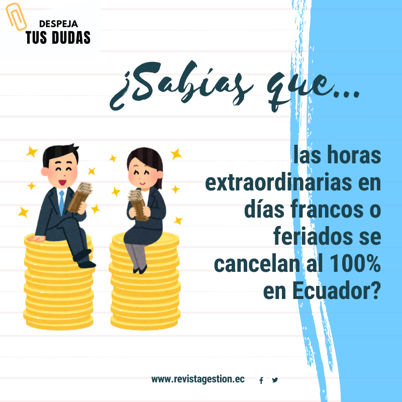 El artículo 55 del Código del Trabajo menciona que las horas extraordinarias, esto es, días francos o feriados, se cancelan al 100 %. Y el pago va relacionado con la remuneración, dice María José Callejas, consultora de recursos humanos.