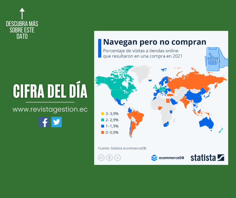 Vitrinear o mirar las vidrieras por internet pero no comprar es la regla y no la excepción. Este es el resultado de un estudio realizado por la plataforma de comercio electrónico de Statista, ecommerceDB. Según el análisis, la proporción de visitas a tiendas online que conducen a una compra es sólo del 2,4% en Estados Unidos, aunque éste es un valor relativamente alto en comparación con otros países del mundo, como muestra esta infografía. En 33 de los 57 mercados estudiados, la cifra se sitúa entre el 1% y el 1,9%, y en otros diez países la proporción es incluso menor.