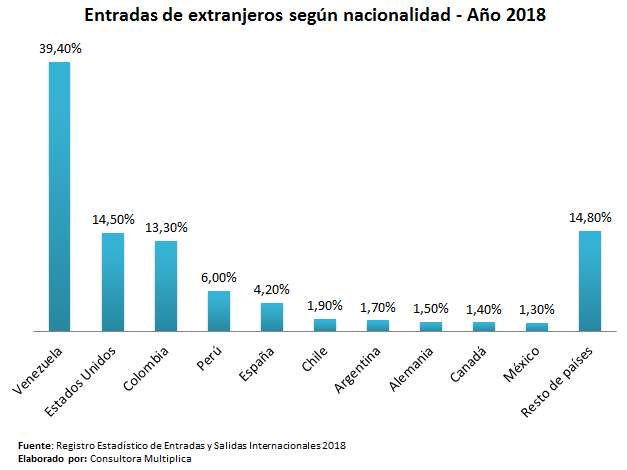Este gráfico indica que en 2018, los extranjeros de Venezuela registraron el mayor porcentaje de entradas al país (39,4%), seguidos de personas de Estados Unidos (14,5%) y de Colombia (13,3).