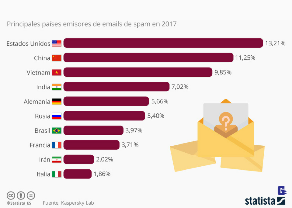 En 2017 Estados Unidos fue el país del mundo desde el que se enviaron más correos electrónicos de spam, con un 13,21% del total. A este le siguió China, con un 11,25%, y Vietnam, con un 9,85%, según un informe de Kaspersky Lab. Según la citada fuente, el tráfico de estos mensajes electrónicos disminuyó un 1,68% respecto a 2016, todavía suponiendo el 57% del total.
