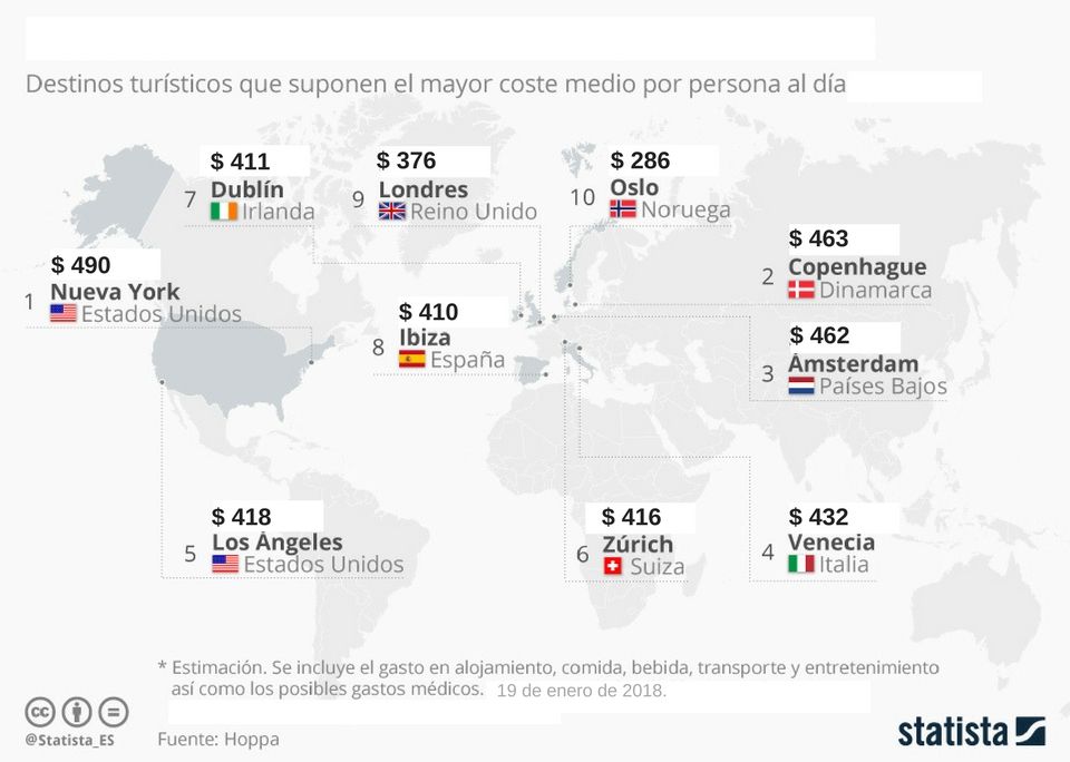 La agencia de viajes Hoppa ha publicado un informe en el que analiza los destinos vacacionales más caros y más baratos del mundo para 2018. Así, compara un total de 100 lugares mediante una serie de indicadores, entre los que se encuentra el coste del alojamiento, comida y el transporte. Como muestra esta infografía de Statista, una noche en Nueva York supone un gasto medio de $ 490 por persona. De esta forma, la ciudad de los rascacielos lidera la clasificación mundial, seguida por Copenhague y Ámsterdam.
