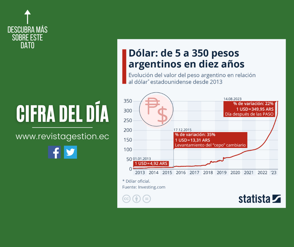 Este gráfico de Statista muestra cómo la divisa argentina se ha devaluado progresivamente en los últimos años con respecto al dólar estadounidense. Para realizar esta infografía se tomó en cuenta el dólar oficial, ya que en Argentina hay más de diez tipos de dólar distintos. Así, mientras que a principios de 2013 cada dólar equivalía 4,92 pesos argentinos, el pasado lunes 14 de agosto el número de divisas argentinas por cada dólar era de casi 350.