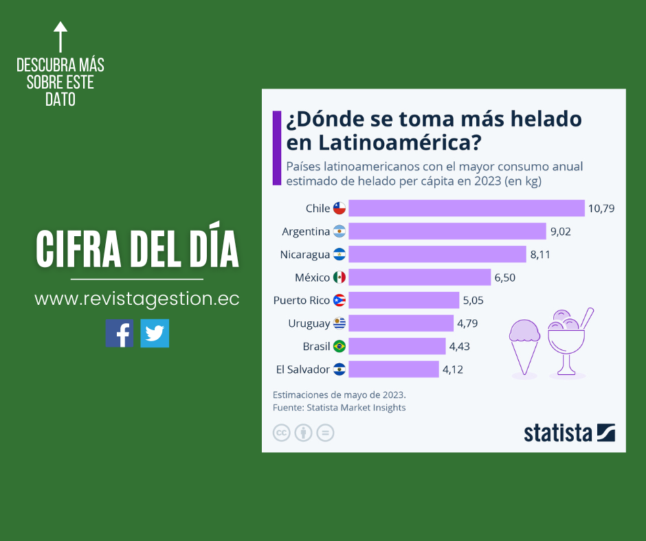 ¿Qué países de América Latina consumen más helado? Como revelan las últimas estimaciones de Statista Market Insights, Los chilenos encabezan la lista, con casi 11 kilos de helado consumidos por habitante al año, seguidos de los argentinos (9 kilos). En Nicaragua cada persona consume 8 kilos al año, mientras que en México cada habitante disfruta de 6,5 kilos al año.