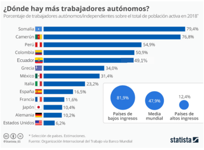 Esta infografía de Statista muestra cómo existe una correlación inversa entre la proporción de trabajadores autónomos y la renta de los países. Así, según datos de la Organización Internacional del Trabajo vía Banco Mundial en las economías de altos ingresos solo el 12,4% de los trabajadores son independientes de media, mientras que en las de bajos esta cifra asciende al 81,9%.