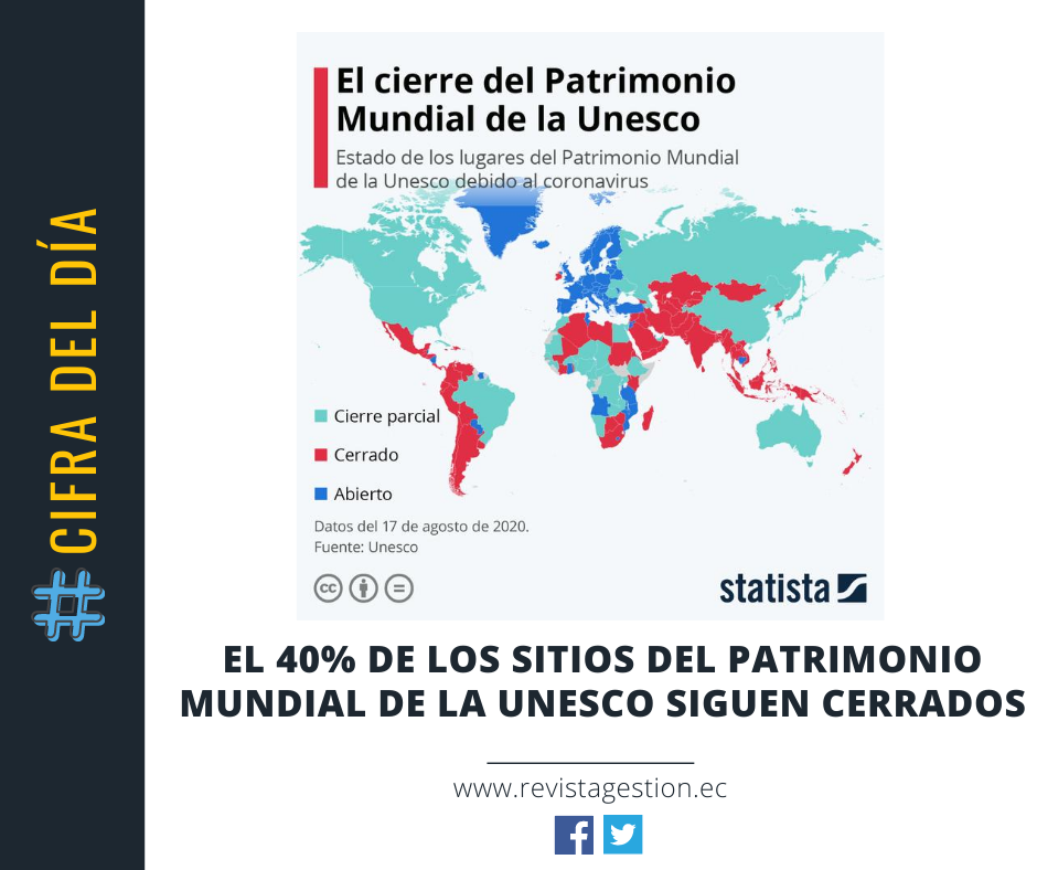 La Lista del Patrimonio Mundial de la Unesco incluye un total de 1.121 lugares naturales, culturales y mixtos que se encuentran en 167 países. Tal y como muestra la siguiente infografía, elaborada con datos de la Unesco, a 17 de agosto, 74 países (el 40%) tienen cerradas todas sus joyas patrimoniales, 32 países (el 25%) tienen cierres parciales y 53 (el 35%) mantienen sus lugares abiertos.