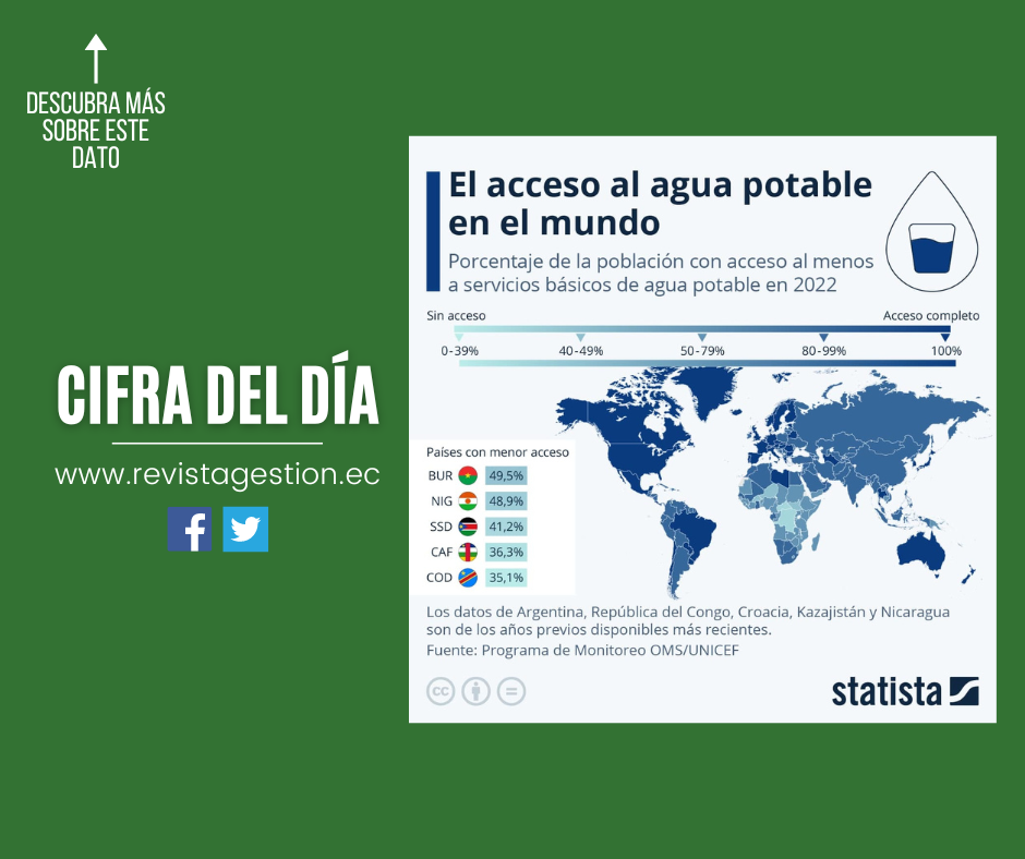 Para cierta parte de la población mundial es normal abrir el grifo y servirse un vaso con agua para beber, o simplemente ir a la tienda de la esquina a comprar un garrafón de agua potable, pero desafortunadamente este no es el caso para millones de pobladores de algunas regiones. De acuerdo con el Programa de Monitoreo del Abastecimiento de Agua, el Saneamiento y la Higiene de la OMS y Unicef, en 2022 cerca del 90% de la población mundial contaba con al menos acceso básico a fuentes de agua potable. Un acceso básico se refiere a que las personas tengan una fuente de agua para consumo en su vivienda o por lo menos cerca de ella con un tiempo máximo de recogida de 30 minutos.