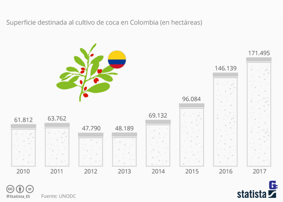 El Observatorio Europeo de Drogas y Toxicologías ha advertido que en Europa hay más cocaína disponible que nunca e identifica como una de las causas el aumento de su producción en América Latina. Un informe de la Oficina de Naciones Unidas contra la Droga y el Delito publicado esta semana confirma la mayor oferta de esta droga, al menos en el caso de su mayor distribuidor mundial, Colombia. Así, si uno se atiende a la superficie de la planta de coca cultivada, esta ha pasado de abarcar alrededor de 146.100 hectáreas en 2016 a 171.500 en 2017, un 17% más. Además, la producción potencial de clorhidrato de cocaína, es decir, el extracto preparado de coca para el consumo, ha crecido un 31% hasta alcanzar las 1.379 toneladas métricas.