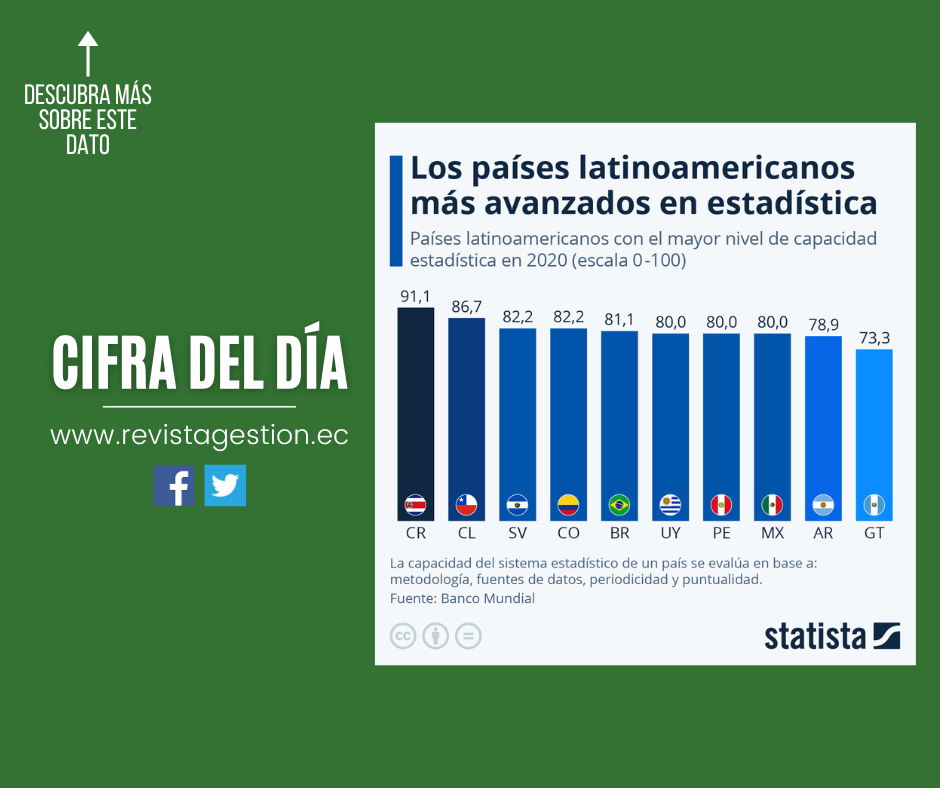 El Banco Mundial, a través del indicador de la capacidad estadística, analiza la capacidad del sistema estadístico de los Estados, evaluando su desempeño en tres áreas: la metodología, las fuentes de datos y la periodicidad y puntualidad. La entidad define la capacidad estadística como “la aptitud de un país para recopilar, analizar y difundir datos de alta calidad sobre su población y su economía”. En la edición de 2020 de este sondeo, Costa Rica fue el país más avanzado en capacidades estadísticas en Latinoamérica, con una puntuación de 91,1 en una escala de 0 a 100. En segundo lugar se ubicó Chile, con 86,7 puntos, seguido de El Salvador, con 82,2.