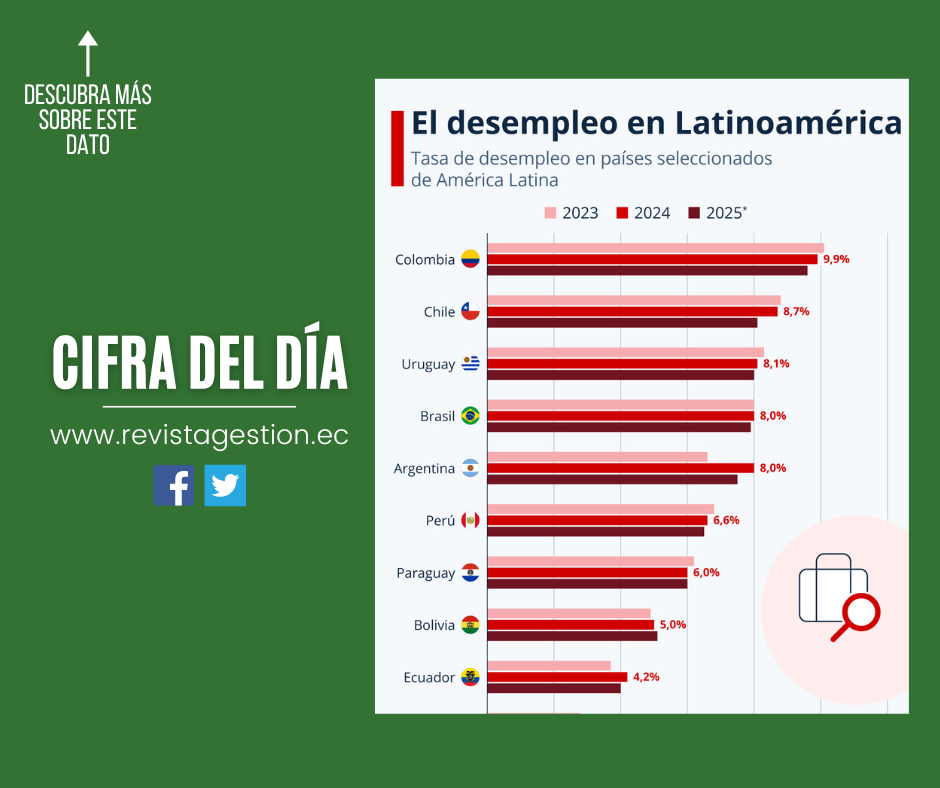 Este año, según las proyecciones del FMI, en Colombia el porcentaje de personas sin trabajo es del 9,9%, seguido por Chile (8,7%) y Uruguay (8,1%). El organismo aclara que las definiciones de cada país con respecto al desempleo pueden variar, pero, en líneas generales, una persona desempleada es aquella que forma parte de la población activa y que se encuentra en la búsqueda de empleo sin conseguirlo.