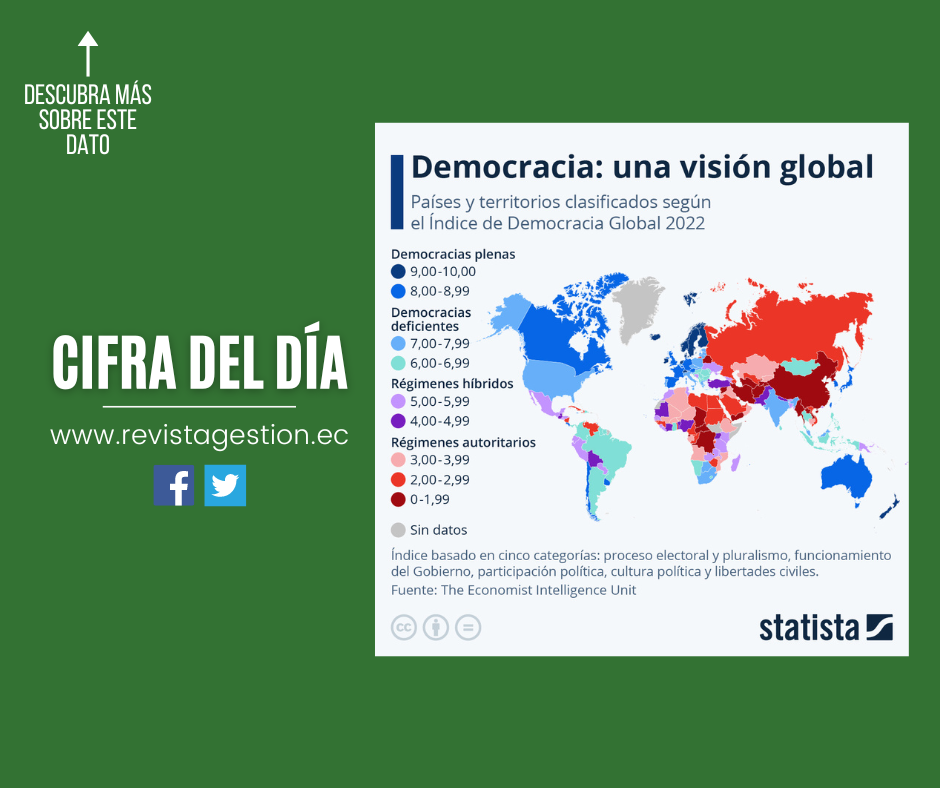 El 'Índice de Democracia Global' elaborado por la 'Unidad de Inteligencia' de la revista británica The Economist, otorga desde 2006 una puntuación a la salud democrática del planeta (representada por 167 Estados). El informe establece cuatro categorías para calificar el nivel democrático de cada país —democracia plena, democracia deficiente, régimen híbrido y régimen autoritario— en base a su sistema electoral y pluralismo político, las libertades civiles, el funcionamiento de su Gobierno, la participación política y la cultura política.