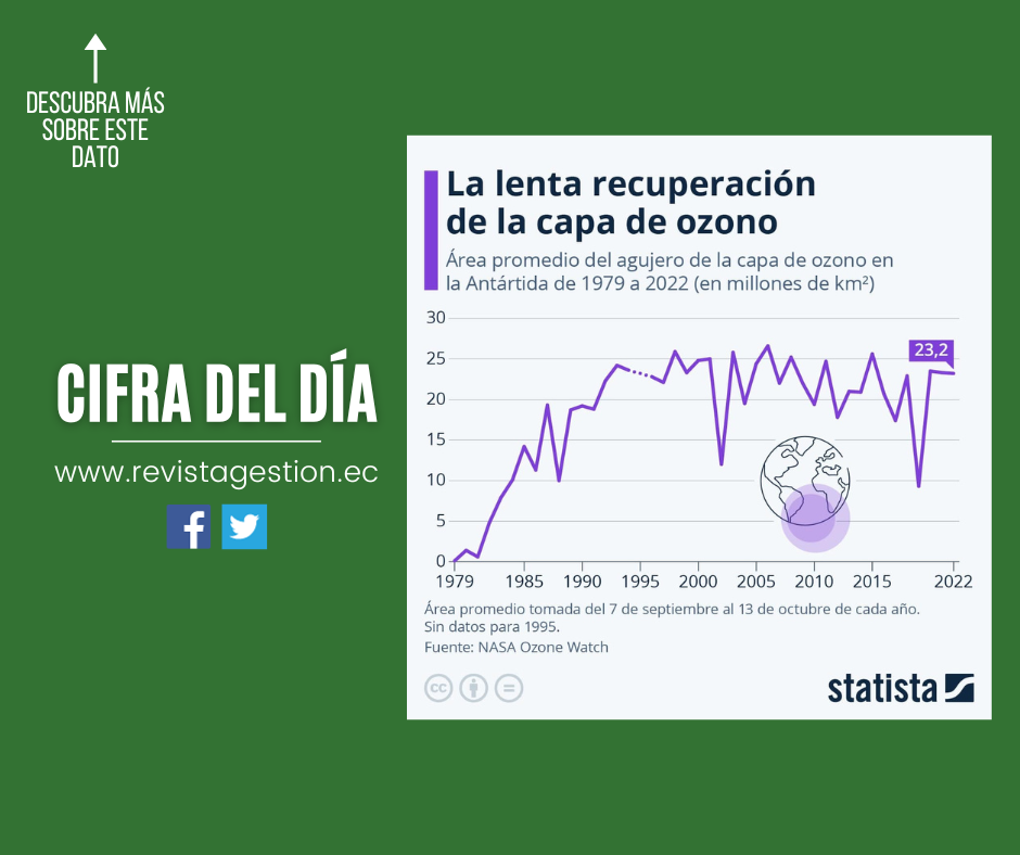 De acuerdo con datos de la Administración Nacional de Aeronáutica y el Espacio de los Estados Unidos (NASA), el área promedio del agujero de la capa de ozono en la Antártida en 2022 fue de 23,2 millones de kilómetros cuadrados, cifra que se ha mantenido estable en los últimos tres años, dando señales positivas sobre la recuperación de tan importante capa.