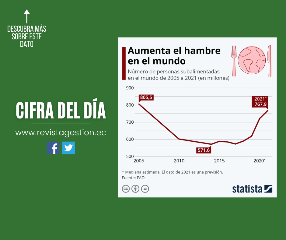 Tras permanecer relativamente sin cambios desde 2015, el porcentaje de personas afectadas por el hambre se disparó en 2020 y siguió aumentando en 2021, según datos del último informe "El estado de la seguridad alimentaria y la nutrición en el mundo" publicado recientemente por la Organización de las Naciones Unidas para la Alimentación y la Agricultura (FAO). El año pasado, entre 701,9 y 828 millones de personas padecían hambre en todo el mundo. Considerando el punto medio del rango estimado (767,9 millones), el hambre afectaba en 2021 a 46 millones de personas más que en 2020 y a 150 millones más que en 2019. Esto habría dejado al 9,8% de la población mundial afectada por el hambre en 2021, frente al 9,3% en 2020 y el 8% en 2019.