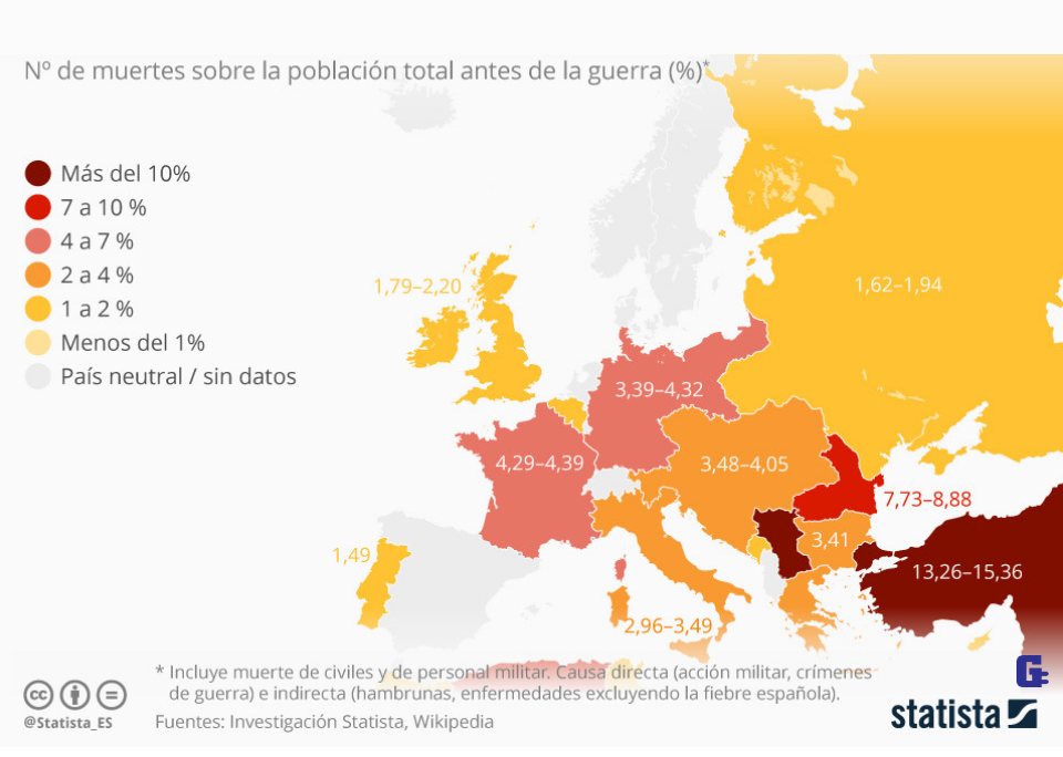 Se calcula que alrededor de 20 millones de personas perdieron la vida como consecuencia directa o indirecta (debido a hambrunas y enfermedades) de la Gran Guerra. En algunas potencias la tasa de población fallecida superó el 10% del total, como en Serbia (entre el 17% y 28%) y el Imperio Otomano (entre el 13% y el 15% de los habitantes).