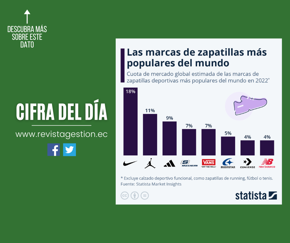 Según estimaciones de Statista Market Insights, el mercado mundial de las zapatillas deportivas —excluyendo el calzado deportivo puramente funcional— alcanza actualmente un valor de alrededor de 75.000 millones de dólares estadounidenses y se espera que crezca hasta los casi 100.000 millones en 2028. Con una cuota de mercado del 18%, Nike es el claro número uno en el panorama mundial de las zapatillas deportivas. Sin embargo, esa cifra subestima el dominio de Nike, ya que tanto la marca Jordan, en segundo lugar, como Converse, en el séptimo, también son propiedad del gigante de la ropa deportiva con sede en Beaverton, Oregón (Estados Unidos).