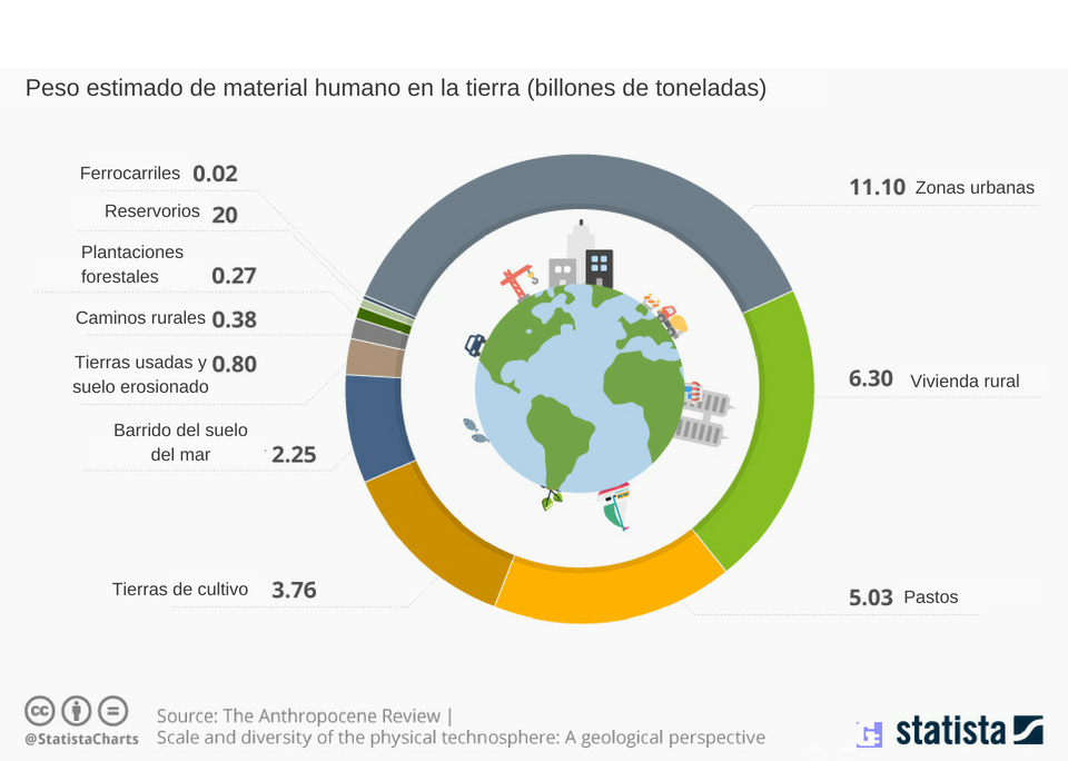 Ninguna otra especie ha tenido un efecto dramático sobre el planeta tierra como lo han hecho los seres humanos. Según una investigación publicada en el Anthropocene Review, el peso del 'material de la empresa humana contemporánea' asciende a 30.11 billones de toneladas.