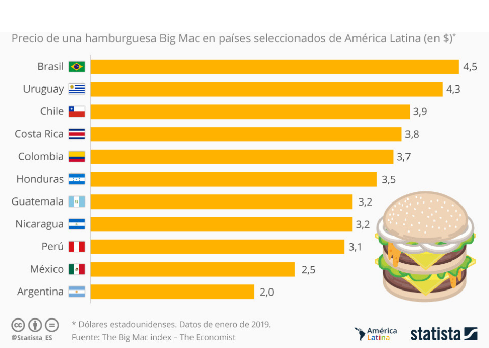 Según los valores de 2019 de este índice, Brasil es el país latinoamericano con el Big Mac más costoso de la región, con un precio de aproximadamente 4,5 dólares por hamburguesa, mientras en Argentina se puede comer una de estas hamburguesas por solo dos dólares.