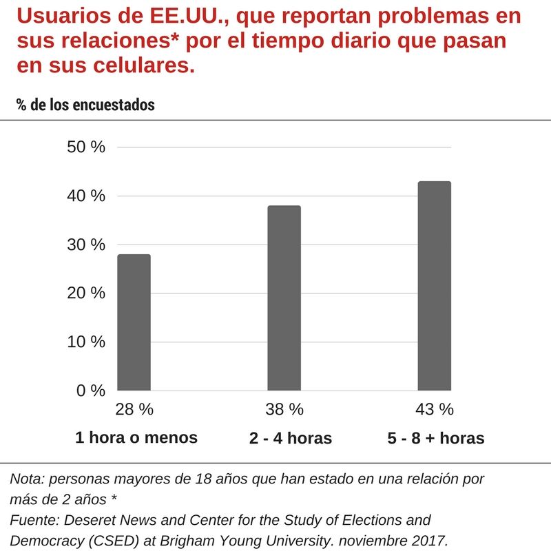 Una nueva encuesta llevada a cabo por Deseret News y el Centro para el estudio de las elecciones y la Democracia (CSED) de la Universidad de Brigham Young en Estados Unidos, concluyó que las personas que pasan más tiempo en sus dispositivos, tienen más probabilidades de experimentar problemas en sus relaciones de pareja. De hecho, el 43% de los encuestados que dijeron que pasan entre cinco y ocho horas o más al día en su dispositivo reconocen problemas en su relación.