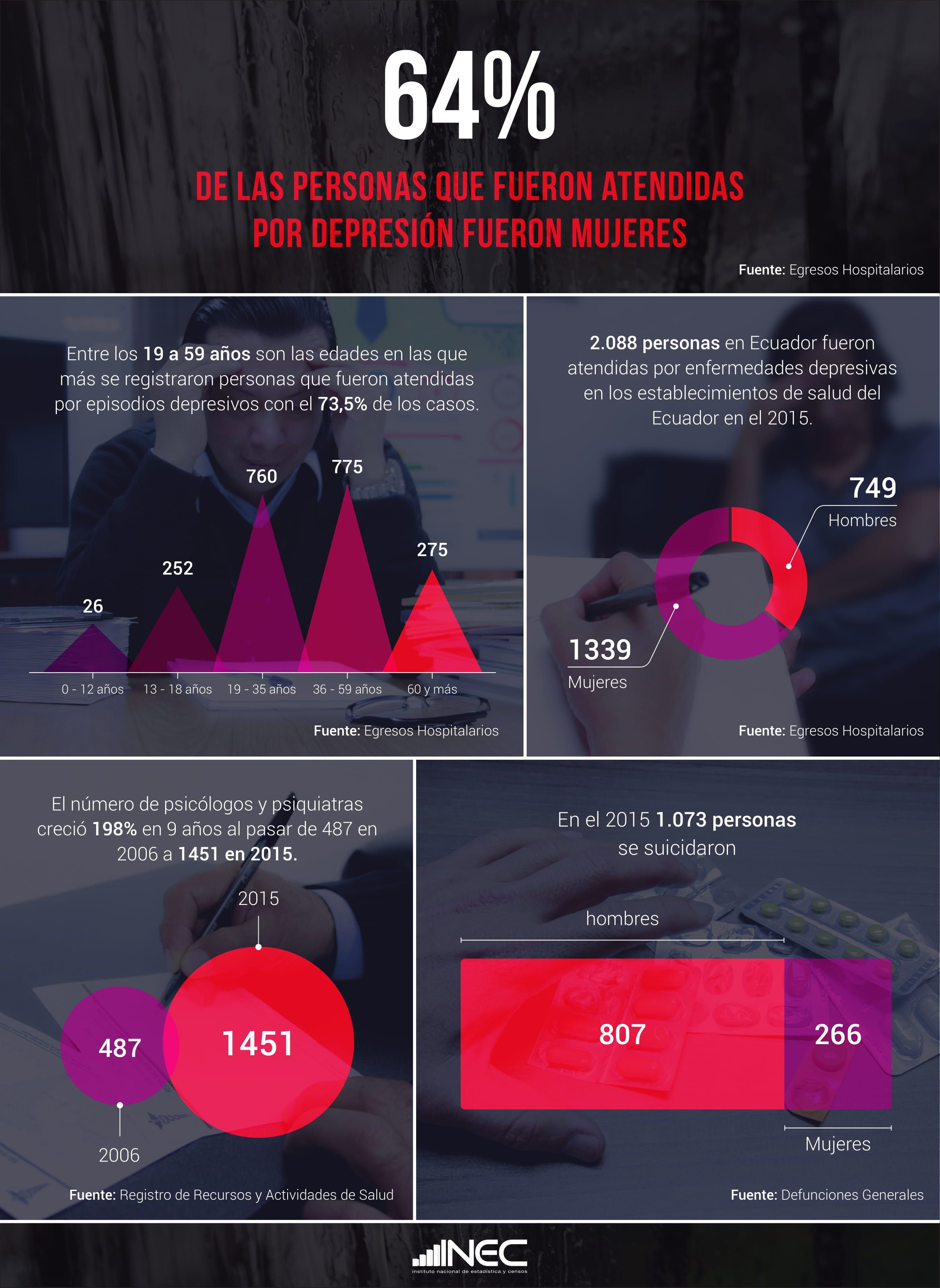 Según el más reciente informe del INEC, en el 2015 1.073 personas en Ecuador se suicidaron. De ellas 807 fueron hombres, mientras que 266 fueron mujeres.